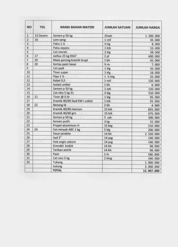 | Nama | Bank | Tanggal | Jumlah (Rp) | Total (Rp) |