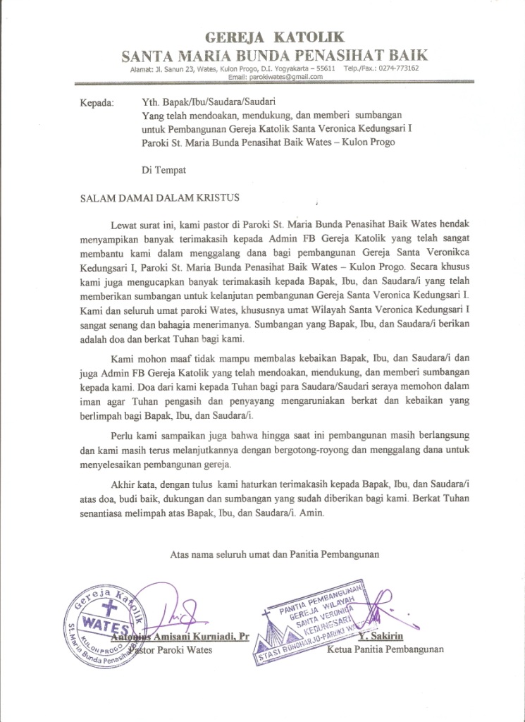 | Surat Resmi Ucapan Terima Kasih Penerimaan Bantuan dari Paroki Wates untuk Gereja Kedungjati |